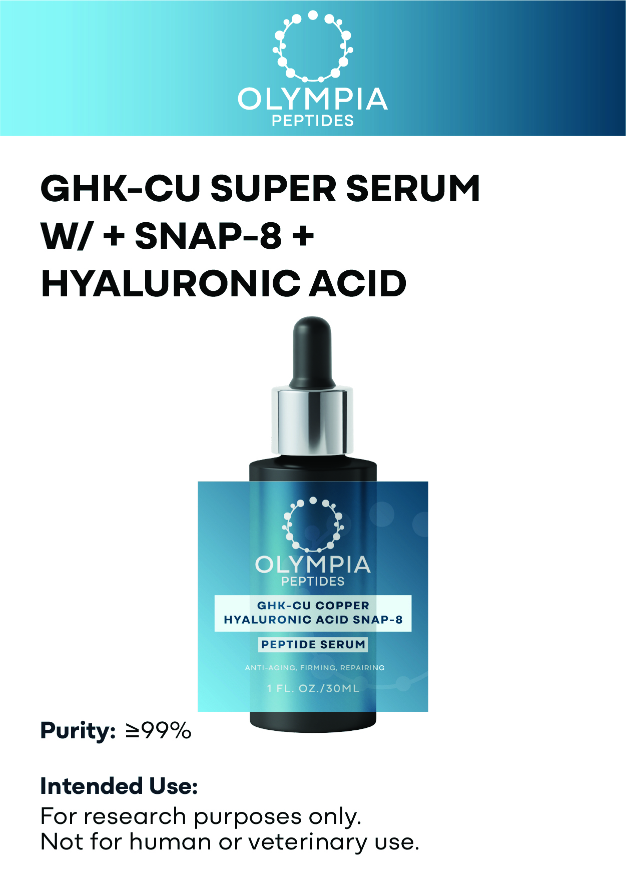 The GHK-Cu + SNAP-8 + Hyaluronic Acid Serum combines three studied actives to support skin appearance and hydration. GHK-Cu (Copper Tripeptide-1) has been shown in research to promote collagen synthesis and improve skin elasticity through its role in cellular signaling and tissue remodeling. SNAP-8 (Acetyl Octapeptide-3) is a peptide complex often studied as a topical alternative to neuromodulators, targeting the reduction of dynamic expression lines by helping to minimize muscle contraction intensity. Complementing these peptides, Hyaluronic Acid delivers multi-layer hydration, supporting a plump and smooth appearance.